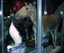 Подпись: «Квагга. Вымершие в результате охоты в 1883 году, квагги были типом зебр. Это один из всего семи существующих скелетов».