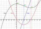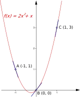 Как и любая целая рациональная функция квадратичная функция дифференцируема во всей своей области определения. Её производная легко находится с помощью элементарных правил дифференцирования: . Таким образом, видим, что производной квадратичной функции является линейная функция, которая либо строго монотонно возрастает (если ), либо строго монотонно убывает (если ) на всей области определения. При этом также нетрудно заметить, что , что означает, что коэффициент в уравнении исходной функции равен угловому коэффициенту параболы в начале координат.