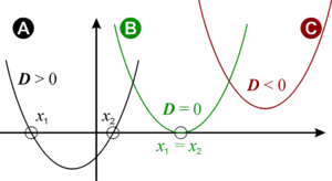 - Если , то функция имеет два действительных нуля и парабола пересекает ось абсцисс в двух точках;