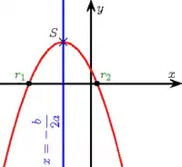 Так как ось симметрии параболы всегда проходит через её вершину, то, очевидно, что нули квадратичной функции также всегда симметричны относительно абсциссы вершины параболы. Этот факт позволяет легко вычислить координаты вершины параболы с помощью известных нулей функции. В поле действительных чисел этот способ действует только тогда, когда парабола пересекает ось абсцисс или касается её, то есть имеет нули из действительной области.