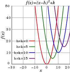 Любая квадратичная функция может быть получена с помощью растяжения/сжатия и параллельного переноса простейшей квадратичной функции . Так, график функции вида получается путём сжатия (при ) или растяжения (при ) графика функции в раз с последующем его параллельным переносом на единиц вправо и единиц вверх (если эти значения являются отрицательными числами тогда, соответственно, влево и вниз). Очевидно, что при проделанной трансформации вершина параболы функции переместится из точки в точку . Этот факт даёт ещё один способ вычисления координат вершины параболы произвольной квадратичной функции путём приведения её уравнения к виду , позволяющему сразу увидеть координаты вершины параболы — .
