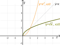 Так, функция арифметического квадратного корня является обратной к квадратной функции на интервале . Соответственно, функция является обратной к функции на интервале . Графики функций и будут симметричными друг другу относительно прямой .