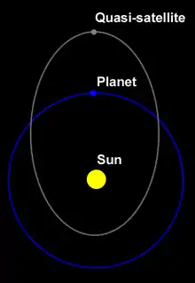 Период обращения квазиспутника вокруг Солнца в точности соответствует периоду обращения планеты, однако квазиспутник имеет другой эксцентриситет орбиты, обычно превышающий эксцентриситет орбиты планеты. Относительно планеты квазиспутник медленно движется по вытянутой траектории в сторону, противоположную движению планеты.