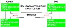 Рассмотрим схему физической реализации квантовой криптографии[1]. Слева находится отправитель, справа — получатель. Для того, чтобы передатчик имел возможность импульсно варьировать поляризацию квантового потока, а приёмник мог анализировать импульсы поляризации, используются ячейки Поккельса. Передатчиком формируется одно из четырёх возможных состояний поляризации. На ячейки данные поступают в виде управляющих сигналов. Для организации канала связи обычно используется волокно, а в качестве источника света берут лазер.