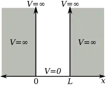 Частица в одномерном потенциале с бесконечными стенками является математически наиболее простым примером, где ограничения приводят к квантованию энергетических уровней. Ящик определяется как имеющая нулевую потенциальную энергию везде внутри определённой области и, следовательно, бесконечную потенциальную энергию повсюду за пределами этой области[54]:77–78. Для одномерного случая в направлении, независимое от времени уравнение Шрёдингера можно записать в виде
