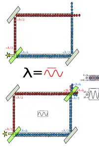 На двух диаграммах на рис. 1 фотоны испускаются из лазера, обозначенного жёлтой звездой, по одному. Они проходят через 50 % светоделитель (зеленый блок), который половину фотонов отражает, а другую пропускает без отражения. Отраженные и прошедшие фотоны движутся по двум разным путям, обозначенным красными и синими линиями.