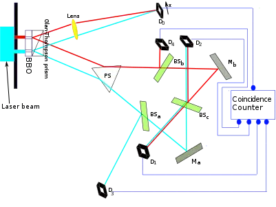 - Длина оптического пути, измеренная от щели до D1, D2, D3 и D4, на 2,5 м длиннее оптического пути от щели до D0. Это означает, что любая информация от холостого фотона получена примерно на 8нс позже, чем от запутанного с ним сигнального фотона.