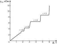 Как было замечено Клитцингом[2], при измерении эффекта Холла в инверсном слое кремниевого МОП транзистора при низких температурах (Т ~ 1 K) и в сильных магнитных полях (B > 1 Тл) линейная зависимость холловского сопротивления сменяется чередой ступеней (плато) как показано на Рис. 2. Величина сопротивления на этих ступеньках равна комбинации фундаментальных физических констант, делённой на целое число :
