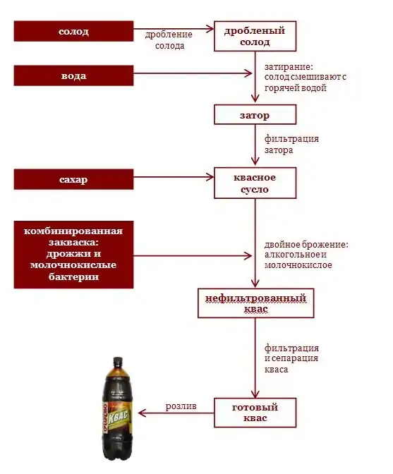 Этапы современного производства кваса почти не отличаются от старинных. Одно из немногих отличий — то, что раньше всевозможные добавки (фрукты, пряности) добавлялись перед брожением, а сейчас — уже после него. Для приготовления кваса необходим солод — пророщенное и высушенное либо прожаренное зерно ячменя (реже — ржи), дрожжи и молочнокислые бактерии, так как в квасе идет двойное брожение: спиртовое брожение сусла и молочнокислое брожение. В процессе брожения в квасе образуется этиловый спирт (он есть и в кефире).