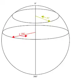Мы можем увидеть похожее поведение на поверхности сферы. Если мы расположимся на северном полюсе и начнём чертить прямые линии, исходящие из него в различных направлениях (то есть линии долготы), то сначала они будут расходиться, но затем снова сойдутся на южном полюсе. Концентрические круги, получившиеся вокруг северного полюса (широты), стянутся в одну точку на южном полюсе — когда радиус сферы сравняется с расстоянием между полюсами. Если думать о разных направлениях из полюса (то есть разные долготы) как о разных осях вращения, а о разных расстояниях от полюса (то есть широтах) как о разных углах вращения, то мы получим пространство для вращений. Получившаяся сфера представляет вращение в трёхмерном пространстве, хотя является двухмерной поверхностью, что не позволяет смоделировать гиперсферу. Однако двухмерную поверхность сферы можно представлять как часть гиперсферы (как окружность является частью сферы). Мы можем взять часть, например, для представления вращения вокруг осей в плоскостях x и y. Важно отметить, что угол вращения до экватора равен 180° (а не 90°); до южного полюса (с северного) 360° (а не 180°).