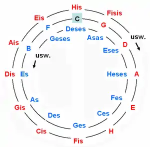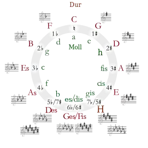 | Ces | Ges | Des | As | Es | B | F | C | G | D | A | E | H | Fis | Cis |