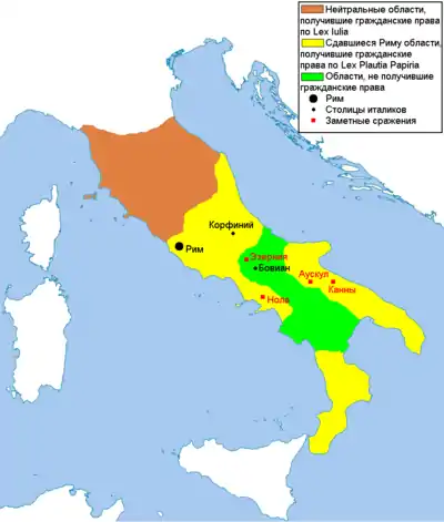 В это время (с конца 91 года до н. э.) Рим воевал с восставшими италиками, и Метелл Пий принимал участие в этой войне. Источники сообщают, что он действовал в Апулии и «взял осадой» город Венусия, в котором захватил три тысячи пленных[46]. Кроме того, Квинт Цецилий разбил в нескольких сражениях марсов[44], которыми командовал Квинт Попедий Силон, причём последний погиб в бою[32]. Возможно, после этих побед солдаты провозгласили Квинта Цецилия императором[47]. В то же время Орозий пишет, что Силон пал «в ходе ужасного сражения у реки Теана», где римлянами командовал легат Гнея Помпея Страбона по имени Сульпиций[48] (это мог быть либо будущий народный трибун Публий Сульпиций[49][50], либо Сервий Сульпиций Гальба[51]). Сообщение эпитоматора Ливия[44] можно трактовать и таким образом, что окончательное поражение Силону нанёс легат Мамерк Эмилий Лепид Ливиан[52].