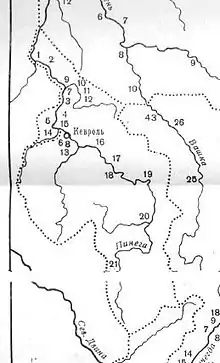 Волости: 1. Пильи Горы, 2. Перемская, 3. Чакола, 4. Пиринема, 5. Деревни по речке Немнюге, 6. Киглохта, 7. Старая Кеврола и Лохта; 8. Чухченема, 9. «На Шетогоре деревни», 10. Карпова гора, 11. Ваймуша, 12. Шардонема, 13. На Кушкополе, на Еркине, на Церкове горе; 14. Покшенга, 15. «На Марьиной горе», 16. Веркольская, 17. Лавела, 18. Сура, 19. Нюхча, 20. Выя, 21. Малая Пинежка.