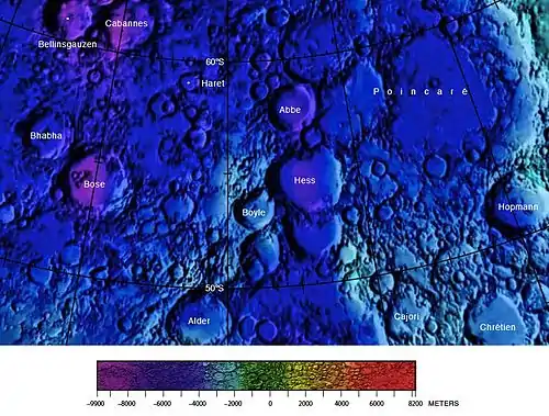 Ближайшими соседями кратера являются кратер Кретьен на западе-северо-западе; кратер Орем на севере; кратер Карман на северо-востоке; кратер Гесс на юго-востоке и кратер Хопман на юго-западе[3]. Селенографические координаты центра кратера 47°40′ ю. ш. 168°42′ в. д.47,67° ю. ш. 168,7° в. д., диаметр 74,7 км[4], глубина 2,8 км[1].
