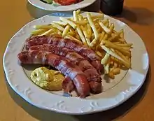 Немецкий: eine Käsekrainer mit scharfem Senf, einem Brotanschnitt und eine Dose Ottakringer Bier[10]