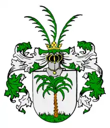 Описание герба: по Долгорукову В серебряном поле на зеленом холме зеленое пальмовое дерево. На гербе дворянские шлем и корона, из коей выходят три пальмовых ветви. Намет серебряный подложенный зеленым. |