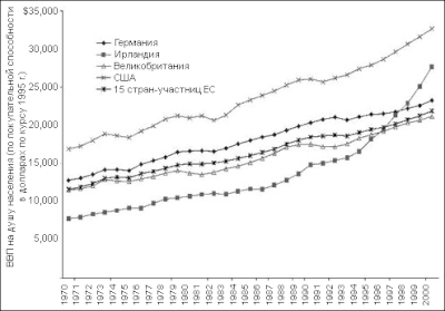 Более двух веков Ирландия была одной из беднейших стран Европы. Однако в 1990-х годах она продемонстрировала впечатляющие темпы экономического роста. К концу этого десятилетия объем ВВП на душу населения в Ирландии превысил соответствующие показатели Великобритании и Германии.