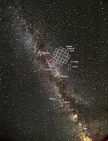 Поле зрения телескопа «Кеплер» ограничивается областью небесной сферы площадью 105 квадратных градусов[9], что равно всего лишь четверти процента площади всей небесной сферы, которая составляет 41253 квадратных градуса[10]. Эта область затрагивает три созвездия Северного полушария небесной сферы — Лебедь, Лира и Дракон[11]. Участок неба, наблюдаемый «Кеплером», легко найти на звёздном небе. Он связан с Летне-осенним треугольником, наиболее заметным астеризмом Северного полушария небесной сферы, хорошо видный летом и осенью в средних широтах Северного полушария Земли. В этом вытянутом равнобедренном треугольнике из трёх ярких звёзд — Вега (α Лиры), Денеб (α Лебедя) и Альтаир (α Орла) — короткая сторона (Денеб — Вега) пересекает указанный участок и сопоставима с ним по размерам.