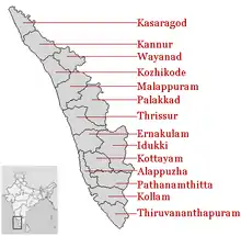 До 1956 года южная часть Кералы представляла собой штат Траванкур-Кочин в составе четырёх округов: Тривандрам (Тируванантапурам), Коллам, Коттаям и Триссур (с 1949 года). Северная часть Кералы входила в состав штата Мадрас как округ Малабар. В 1956 году штат приобрёл современные границы.