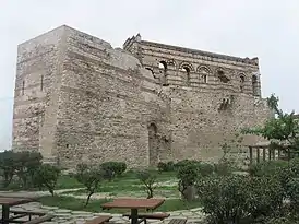 ![]() Дворец Багрянородного (справа) и примыкающий к нему участок Феодосиевых стен, левее которого скорее всего находилась Керкопорта | ||