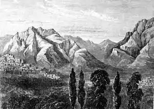 Вид на Керманшах в середине XIX века — на юг, гора Фарохшад и гора Уаси видны на заднем плане