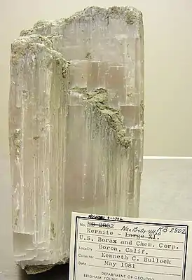 Кернит, также известный как rasorite, представляет собой гидратированный натрий борат гидроксид минеральный с формулой Na 2B 4О 6(ОЙ) 2· 3H 2O . Это минерал от бесцветного до белого цвета, кристаллизующийся в моноклинной кристаллической системе, обычно встречающийся в виде призматических или игольчатых кристаллов или гранулированных масс. Он относительно мягкий, с твердостью по шкале Мооса от 2,5 до 3 и легкий с удельным весом 1,91. Он демонстрирует идеальный скол и хрупкий излом.