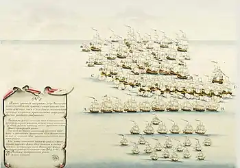 - Репетичное судно «Полоцк», 14 пушек, Г. Г. Белле (судно, предназначенное для репетования, то есть повторения сигналов, которые поднимал флагман).