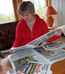 Айли Кескитало (2009): слева — читает газету Ávvir, единственную в мире ежедневную газету на северносаамском языке; справа — в традиционной саамской одежде | ||||||||||