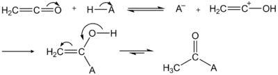 Реакция идет через образование енольного аддукта, который затем таутомеризуется в ацетильное производное: