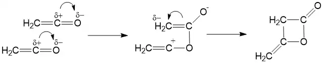 Кетены склонны вступать в реакции [2+2]-циклоприсоединения с соединениями с двойными связями: Так, жидкий кетен склонен к димеризации в дикетен: