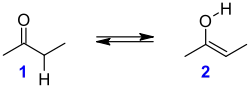 Кетоны, которые имеют по крайней мере один альфа-водородный атом, подвергаются кето-енольной таутомеризации. Таутомеризация катализируется как кислотами, так и основаниями. Как правило, кето-форма является более стабильной, чем енольная. Это равновесие позволяет получать кетоны путём гидратации алкинов. Относительная стабилизация енольной формы сопряжением является причиной довольно сильной кислотности кетонов (pKa ≈ 20) в сравнении с алканами (pKa ≈ 50).