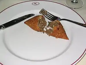 Другой вариант формирования киббеха — плоская лепешка на круглом противне, состоящая из трёх слоёв: нижний и верхний слой из мясной пасты, средний слой — начинка, как правило, с орехами. Лепёшку надрезают ножом на ромбы размером 5—7 см, посыпают измельчёнными орехами, обжаренными с луком, и запекают. Этот вид киббеха иногда едят сырым, наподобие татарского бифштекса[9].