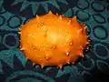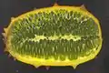 Плод кивано — жёлтого, оранжевого или красного цвета с несъедобной жёсткой кожистой кожурой, покрытой мягкими шипами. Имеет зелёную, похожую на желе мякоть с бледно-зелёными семенами. Длина плода — до 15 см. Семена белые, многочисленные, длиной до 1 см.[3]
