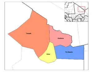 На юге граничит с областью Гао, на западе с областью Томбукту, на северо-востоке с Алжиром, на востоке с Нигером.