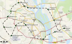 - Карта маршрута городской электрички Киева, график движения поездов, онлайн-расписание, режим работы станций, стоимость проезда. infoportal.kiev.ua. Дата обращения: 12 января 2019.