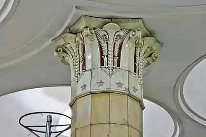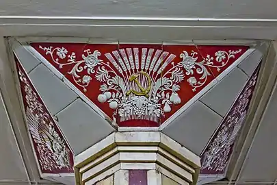 Круглые колонны облицованы светлым мрамором «Газган» желтоватых и голубоватых тонов, керамические капители украшены колосьями пшеницы. Пол выложен серым и розовым гранитом, образующим национальный украинский орнамент. Облицовка путевых стен: глазурованная керамическая плитка (вверху) и красный искусственный камень (внизу). Выполнивший проекты вестибюля и подземного зала станции архитектор Д. Н. Чечулин вдохновлялся древними памятниками Помпей, Венеции и Флоренции, которые он посетил перед началом проектирования в ходе большого Средиземноморского турне[2].
