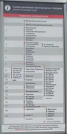 - Пригородные электропоезда до станций: Очаково (2), Солнечная (3), Новопеределкино (3), Лесной Городок (4), Апрелевка (5), Нара (8), Обнинское (12), Малоярославец (13), Калуга-1 (19), а также станций Большого кольца — Бекасово-Сорт. (7) и Кресты (10).