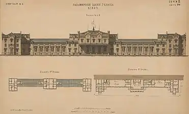 Первый железнодорожный вокзал в Киеве был сооружён по проекту архитектора Н. Вишневского в 1868—1870 годах, и представлял собой двухэтажное здание из жёлтого кирпича в стиле староанглийской готики[5]. Его длина — 133 метра — была немногим меньше размеров пассажирской платформы, которая тянулась на 144 метра. Для «высочайших особ» предназначались специальные, роскошно обустроенные помещения, а грязные и тесные залы ожиданий принимали пассажиров третьего, низшего класса.