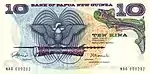 10 | 150×75 | голубой, оранжевый | Парламент Папуа — Новой Гвинеи, герб Папуа — Новой Гвинеи (изображение райской птицы, сидящей на кунду (новогвинейском барабане) и церемониальном копье). | Миска тами, перья райской птицы, кабаний клык из центральных районов Новой Гвинеи, тамбу (деньги из раковин из провинции Восточная Новая Британия). | 2008 |
