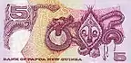 5 | 145×73 | фиолетовый | Парламент Папуа — Новой Гвинеи, герб Папуа — Новой Гвинеи (изображение райской птицы, сидящей на кунду (новогвинейском барабане) и церемониальном копье). | Изображения традиционных денег Папуа — Новой Гвинеи: маска хомбули с региона Сепик, кина (ожерелье из ракушек), ожерелье из ракушек из провинции Новая Ирландия. | 2008 |