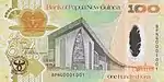 100 | зелёный, оранжевый | Парламент Папуа — Новой Гвинеи, герб Папуа — Новой Гвинеи (изображение райской птицы, сидящей на кунду (новогвинейском барабане) и церемониальном копье). | Изображение основных отраслей экономики Папуа — Новой Гвинеи (горнодобывающая, нефтяная промышленность, транспортировка, технологии) | 2005 | |