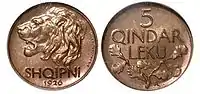 | Квинд (алб. quind)? | Фиери | 1/100 франка Фиери | 1921 | 50 квиндов |