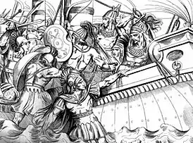 Когда ему отрубили правую руку, он схватился за корабль левой. Потеряв и эту руку, он в конце концов удержал корабль зубами. Таково было мужество этого человека, что он не ослабел после стольких убийств, не был побеждён, потеряв обе руки, а, превратившись в обрубок, сражался зубами, как бешеное животное.
