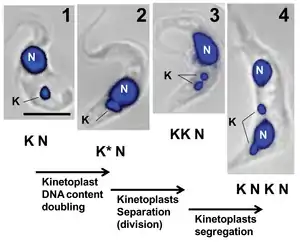 В процессе репликации кинетопласта выделяют пять стадий, каждая из которых связана с удвоением соседнего жгутика. 1. Стадия I. Кинетопласт не начал реплицироваться, в нём нет антиподиальных белковых комплексов. 2. Стадия II. В кинетопласте начинают выявляться антиподиальные комплексы. Начинается удвоение базального тельца жгутика. 3. Стадия III. Начинается отделение нового жгутика, кинетопласт приобретает двухчастный облик. 4. Стадия IV. Дочерние кинетопласты практически разделены и связываются только nabelschnur. 5. Стадия V. Дочерние кинетопласты окончательно разъединяются, nabelschnur разрушается. Структура кинетопластов идентична таковой на первой стадии[4].