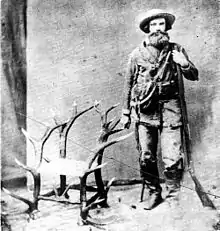 Кинман со своей винтовкой, лосиными рогами, медвежьей лапой, луком со стрелами, топором и скальпами