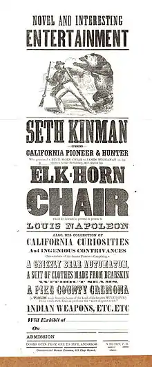 Касаясь доставки стула из рогов президенту Бьюкенену в 1857 г., Кинмэн сказал: «в одно прекрасное утро я проснулся и обнаружили себя знаменитым». Он использовал свою известность начиная с лета 1861 года, вместе с чревовещателем и фокусником Дж. Г. Кеньоном, при открытии выставки, сначала в Юрике, а потом в Сан-Франциско в августе того же года. Кинман показывал свои «раритеты», в том числе кресло из вапити с гризли, несколько скрипок и скальпов, и читал лекцию.