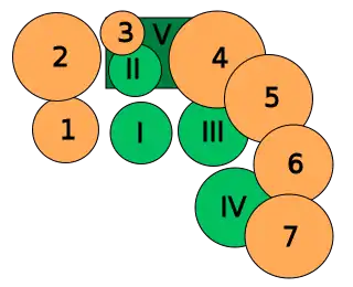 ⬤ Барабаны Drum Workshop I — малый барабан (8 × 14), II — том-том (10 × 12), III — напольный том-том (14 × 16), IV — напольный том-том (16 × 18), V — бас-барабан (16 × 24). |