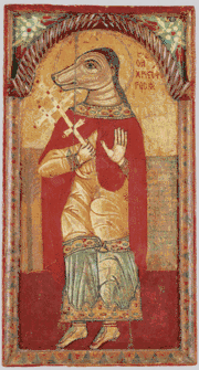 - Святые Ахракас и Аугани — двое святых с собачьей головой описаны в житие коптского святого Меркурия Абу-Сефейна, которому они верно служили и везде сопровождали, их изображения запечатлены на иконе XVIII века в Коптском музее[8][9][10].