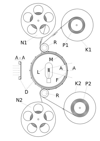 На рисунке вверху представлена схема простейшего аппарата контактной печати с непрерывным движением киноплёнки[7]. Негатив (контратип) фильма сматывается с бобины N1 и через ролик R попадает на печатающий зубчатый барабан D. Из одинарной светонепроницаемой кассеты K1 на этот же барабан поверх негатива сматывается светочувствительная плёнка из рулона P1. Зубчатый барабан представляет собой два синхронно вращающихся венца с общим приводом и промежутком между ними. Лампа накаливания L в кожухе M осуществляет экспонирование через щель F, мимо которой передвигаются оригинал и свежая плёнка, прижатые друг к другу. Затем плёнки сматываются на бобину N2 и в кассету K2 в рулон. После лабораторной обработки экспонированной в аппарате плёнки получают позитив или промежуточный контратип.