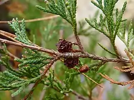 Внешне растение напоминает кипарис, но отличается от него более уплощёнными ветками и более мелкими, созревающими за год шишками, на каждой чешуе которых располагается всего по 2 (а не более, как у кипариса) семечка.